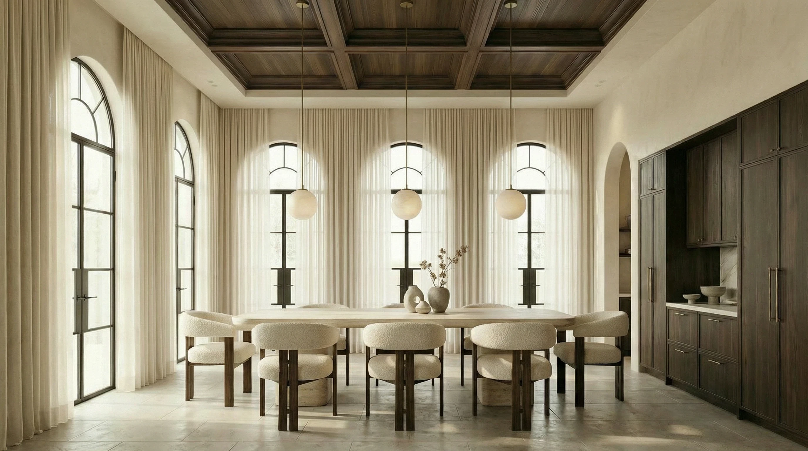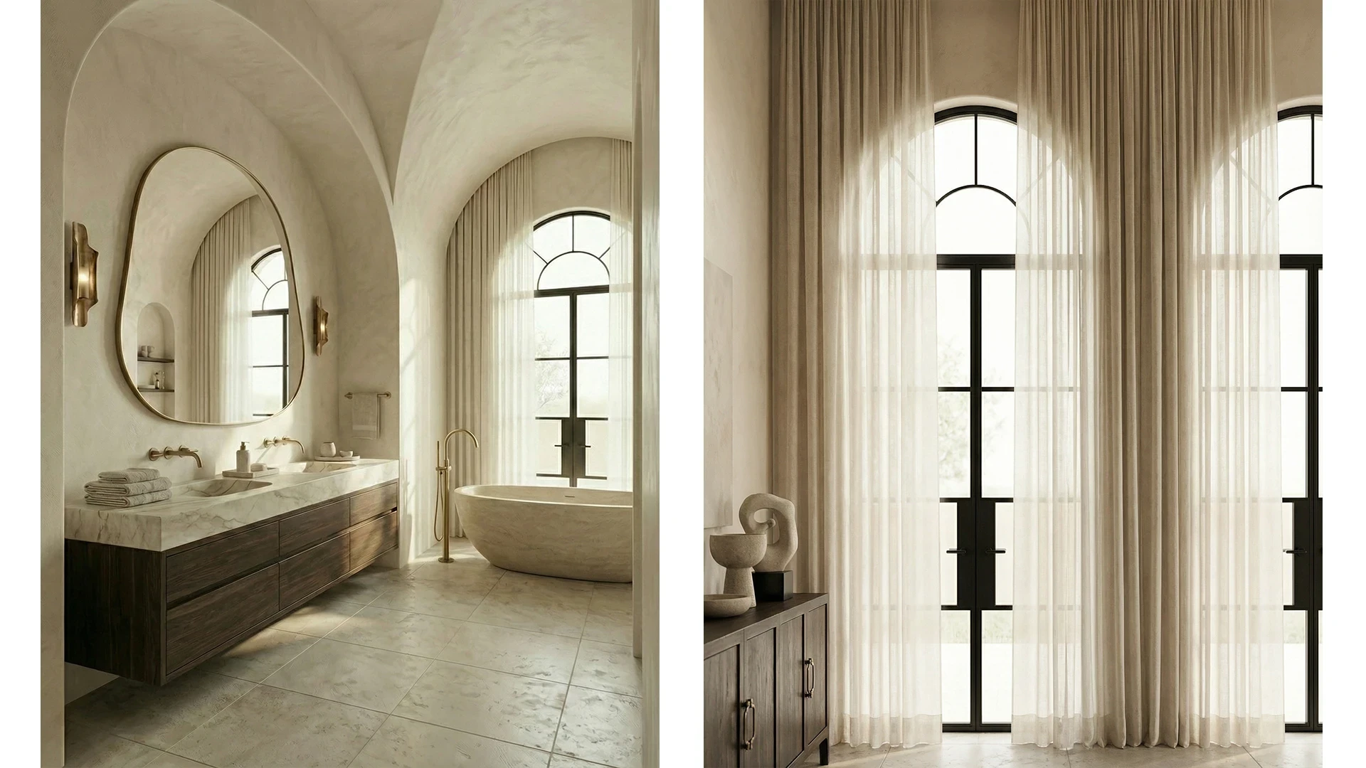 A cohesive residential interior visualization focused on light, material harmony and spatial balance.